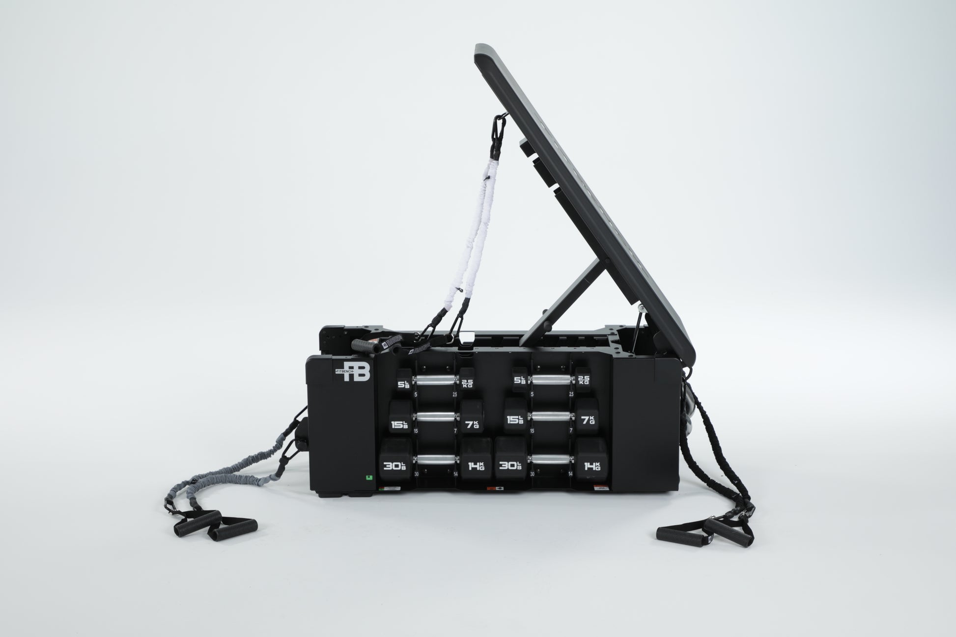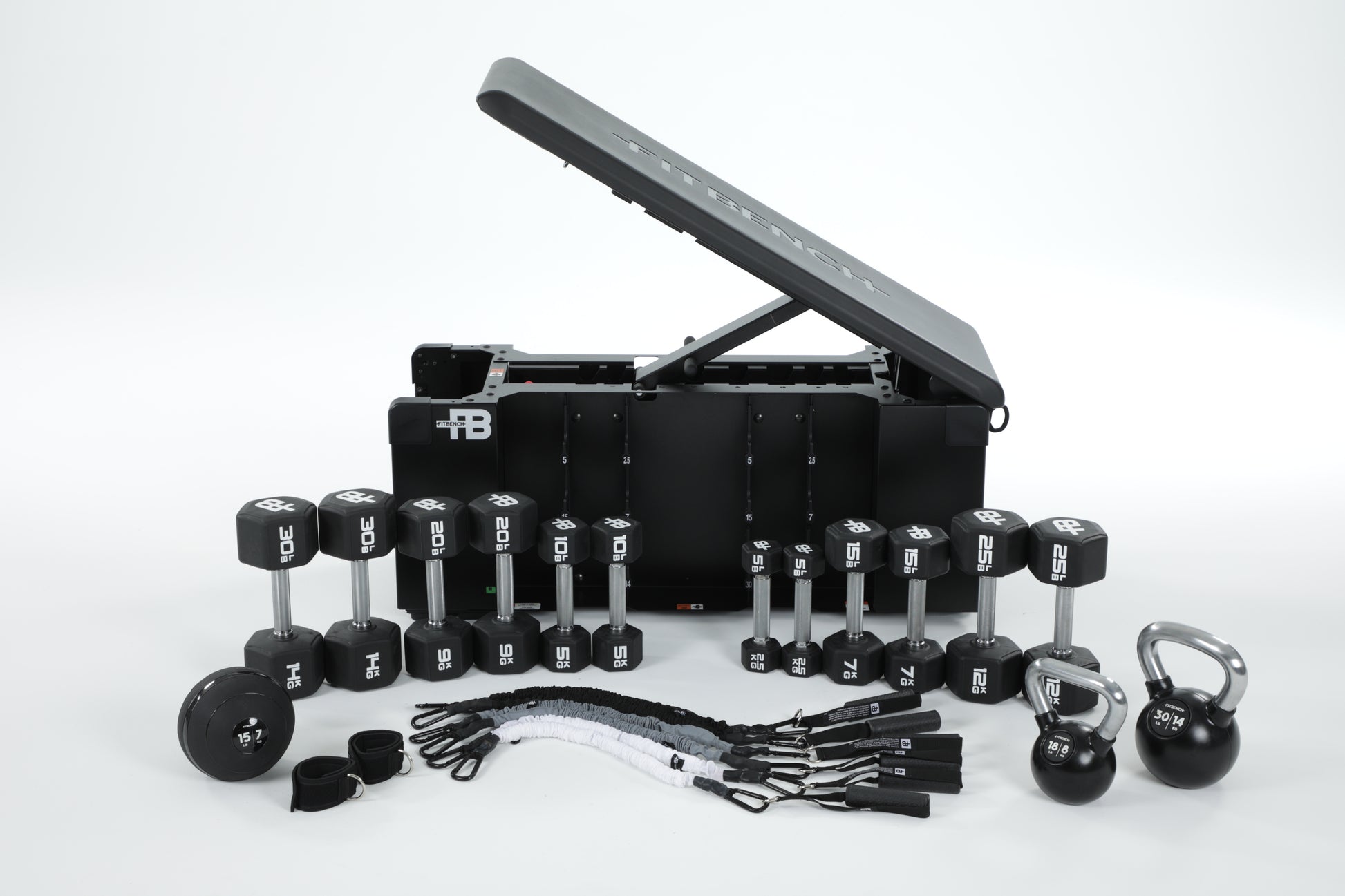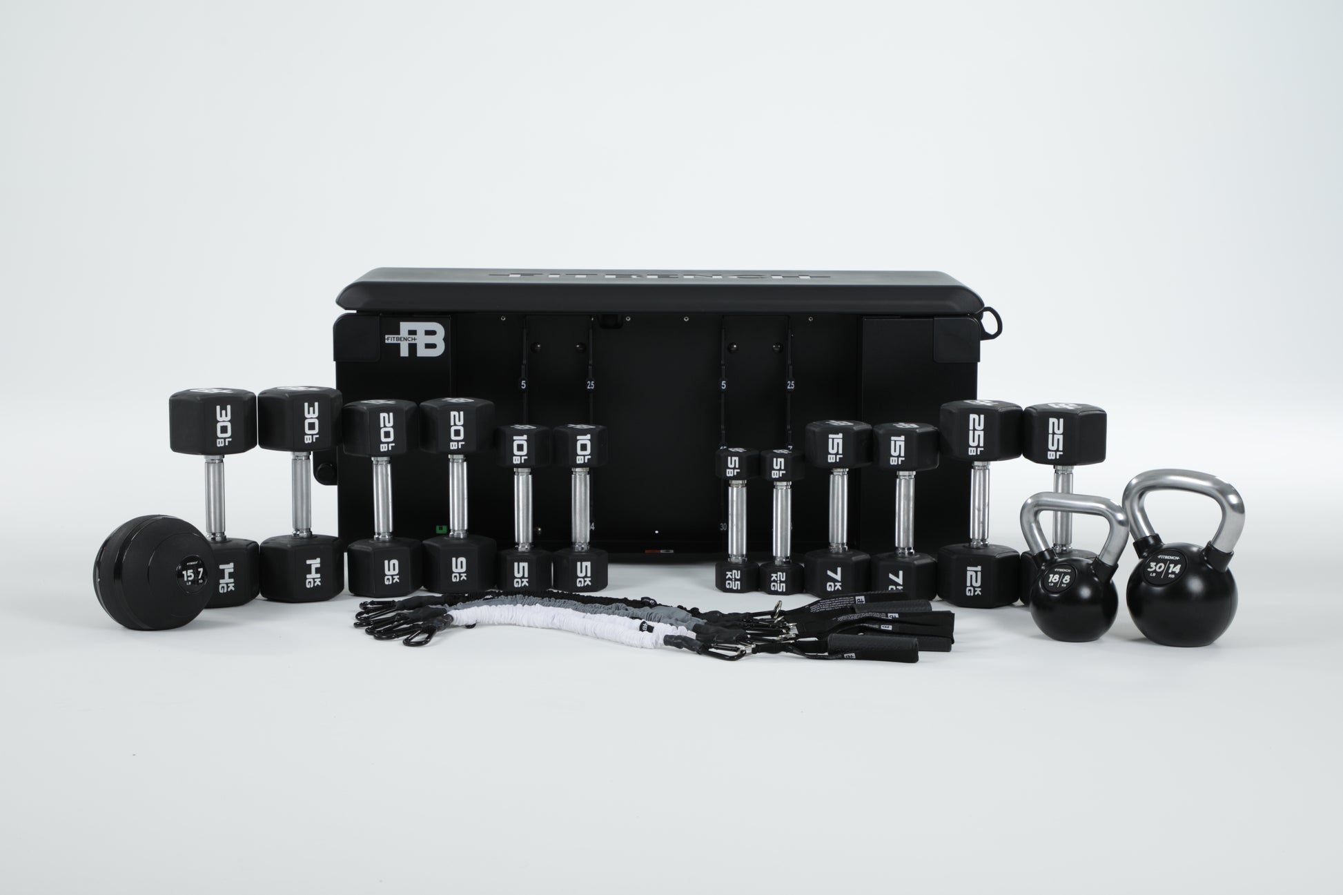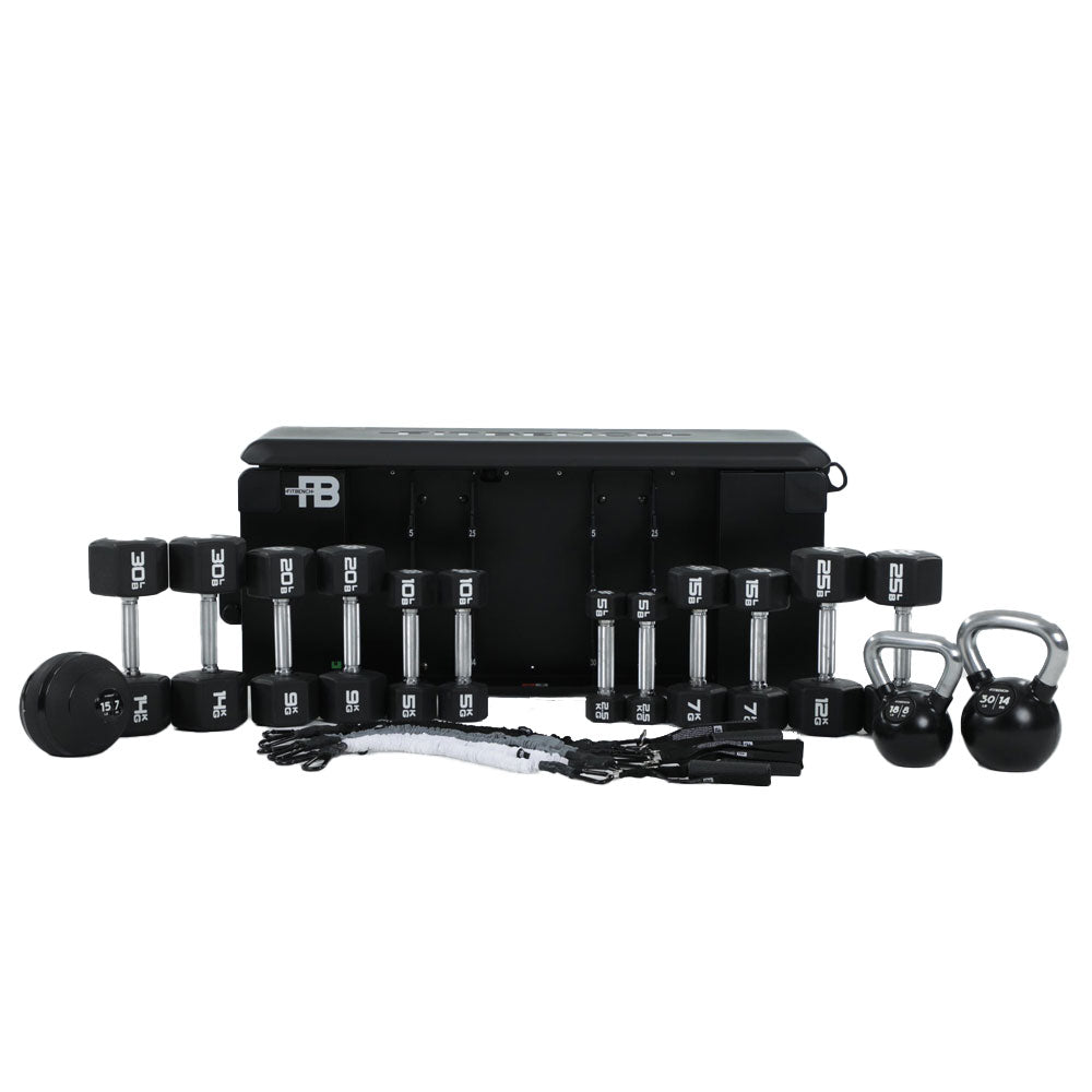 INCLUDES: 5, 10, 15, 20, 25, 30lb dumbbells, 18lb and 30lb kettlebell, 15lb slamball, 10, 20, 40lb resistance band sets, handles, and ankle straps.